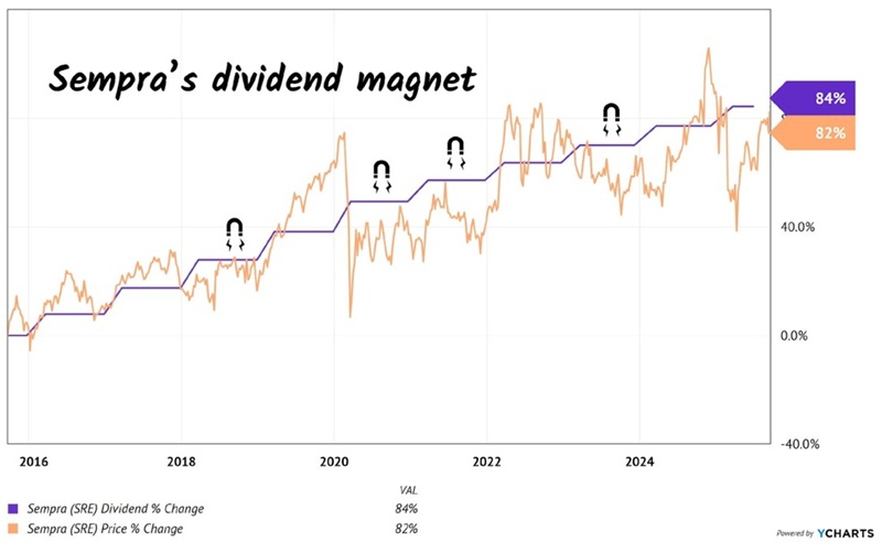 Sempra’s payout has averaged 9% annual increases for 5 years, and it sits 84% higher than a decade ago. No wonder the stock’s up 82% over the same period! The stock price always follows the payout: