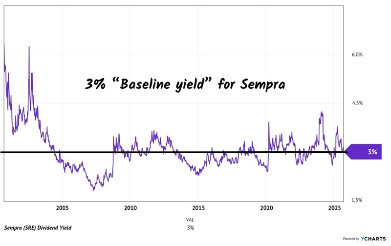 Sempra’s stock price has followed its “dividend magnet” higher over time. This is the hidden force behind Sempra’s current yield—it rarely moves because investors see the rising yield and grab it, bidding up the share price. Over the last 25 years, 3% or so has been the standard “baseline yield” for shares: