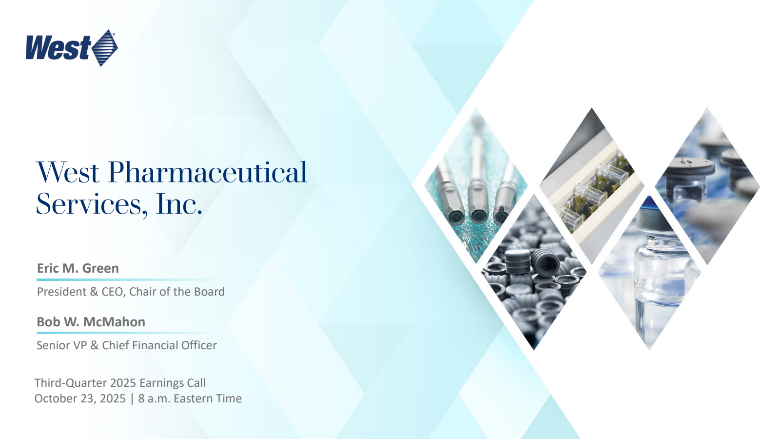 West Pharmaceutical Services (WST) Earnings Date, Estimates & Call Transcripts $307.51 +30.51 (+11.02%) Closing price 10/23/2025 03:59 PM EasternExtended Trading$304.89 -2.63 (-0.85%) As of 10/23/2025 08:00 PM Eastern Extended trading is trading that happens on electronic markets outside of regular trading hours. This is a fair market value extended hours price provided by Polygon.io. Learn more. Add Compare Share Share Earnings Stock AnalysisAnalyst ForecastsChartCompetitorsDividendEarningsFinancialsHeadlinesInsider TradesOptions ChainOwnershipSEC FilingsShort InterestSustainabilityTrendsBuy This Stock West Pharmaceutical Services Earnings Summary West Pharmaceutical Services issued Q3 2025 earnings on October 23, 2025, reporting an EPS of $1.96, which topped the consensus estimate of $1.67 by $0.29. Quarterly revenue rose 7.7% year-over-year to $804.60 million, above analyst estimates of $788.42 million. With a trailing EPS of $6.68 and a P/E Ratio of 46.03, West Pharmaceutical Services' earnings are expected to grow 18.73% next year, from $6.62 to $7.86 per share. Latest Q3 Earnings DateOct. 23EstimatedConsensus EPS (Oct. 23) $1.67 Actual EPS (Oct. 23) $1.96 Beat By $0.29 Actual Revenue (Oct. 23) $804.60MQ3 2025 Earnings ResourcesQ3 2025 Earnings ReportConference Call Transcript & Audio Press Release (8-K) Slide Deck Quarterly Report (10-Q)SEC FilingSlide DeckFull Screen Slide DeckPowered by Get West Pharmaceutical Services Earnings Alerts Want to stay updated on the latest earnings announcements and upcoming reports? Sign up for Earnings360's daily newsletter to receive timely earnings updates on West Pharmaceutical Services and other key companies, straight to your inbox. Sign Up View SMS TermsBy entering your phone number and clicking the sign-up button, you agree to receive periodic text messages from MarketBeat at the phone number you submitted, including texts that may be sent using an automatic telephone dialing system. Message and data rates may apply. Message frequency will vary. Messages will consist of stock alerts, news stories, and partner advertisements/offers. Consent is not a condition of the purchase of any goods or services. Text HELP for help/customer support. Unsubscribe at any time by replying "STOP" to any text message that you receive from MarketBeat or by visiting our mailing preferences page. Read our full terms of service and privacy policy. Skip Charts & View Estimated and Actual Earnings DataWST Earnings Estimates and Actuals by QuarterEarnings Estimates and Acutals by Quarter Chart DescriptionThe chart below shows up to four years of a company's earnings history. The dark blue line represents the company's actual earnings per share. The light blue area represents the range of Wall Street analysts' earnings estimates for each quarter.WST Estimated and Actual Revenue by QuarterEstimated Revenue and Actual Revenue by Quarter Chart DescriptionThe chart below shows up to four years of a company's revenue history. The dark blue line represents the company's actual revenue. The light blue line represents the company's estimated revenue based on the consensus of Wall Street analysts for each quarter. West Pharmaceutical Services Analyst EPS EstimatesQuarterNumber of EstimatesLow EstimateHigh EstimateAverage EstimateRevenue EstimateCompany EPS GuidanceCompany Revenue GuidanceQ1 20252$1.24$1.63$1.44Q2 20252$1.50$1.79$1.65Q3 20252$1.61$1.68$1.65Q4 20252$1.71$1.83$1.77 FY 2025 8 $6.06 $6.93 $6.50 Q1 20262$1.56$1.63$1.60Q2 20262$1.90$1.98$1.94Q3 20262$1.82$1.93$1.88Q4 20262$1.85$2.11$1.98 FY 2026 8 $7.13 $7.65 $7.39 Q1 20271$1.44$1.44$1.44 West Pharmaceutical Services Earnings History by Quarter Custom Range 3 Months 6 Months Year-to-Date 1 Year 2 Years 3 Years 5 Years 10 Years Time Frame Start Date End Date Export to Excel DateQuarterConsensus EstimateReported EPSBeat/MissGAAP EPSRevenue EstimateActual RevenueDetails10/23/2025Q3 2025$1.67$1.96+$0.29$1.92$788.42M$804.60M7/24/2025Q2 2025$1.51$1.84+$0.33$1.82$725.11M$766.50M4/24/2025Q1 2025$1.22$1.45+$0.23$1.23$685.24M$698.00M2/13/2025Q4 2024$1.75$1.82+$0.07$1.78$739.59M$748.80M10/24/2024Q3 2024$1.50$1.85+$0.35$1.85$709.62M$746.90M7/25/2024Q2 2024$1.74$1.52 -$0.22$1.53$729.36M$702.10M4/25/2024Q1 2024$1.29$1.56+$0.27$1.57$670.62M$695.40M2/15/2024Q4 2023$1.78$1.83+$0.05$1.83$740.43M$732.00M10/26/2023Q3 2023$1.86$2.16+$0.30$2.18$750.31M$747.40M West Pharmaceutical Services Earnings - Frequently Asked Questions When did West Pharmaceutical Services announce their last quarterly earnings? West Pharmaceutical Services (NYSE:WST) last announced its quarterly earning data on Thursday, October 23, 2025. Learn more on WST's earnings history. What guidance has West Pharmaceutical Services issued on next quarter's earnings? West Pharmaceutical Services issued an update on its FY 2025 earnings guidance on Thursday, October, 23rd. The company provided EPS guidance of 7.060-7.110 for the period, compared to the consensus EPS estimate of 6.760. The company issued revenue guidance of $3.1 billion-$3.1 billion, compared to the consensus revenue estimate of $3.0 billion. Did West Pharmaceutical Services beat their earnings estimates last quarter? In the previous quarter, West Pharmaceutical Services (NYSE:WST) reported $1.96 earnings per share (EPS) to beat the analysts' consensus estimate of $1.67 by $0.29. Learn more on analysts' earnings estimate vs. WST's actual earnings. How can I listen to West Pharmaceutical Services' earnings conference call? The conference call for West Pharmaceutical Services' latest earnings report can be listened to online. Listen to Conference Call How can I read West Pharmaceutical Services' conference call transcript? The conference call transcript for West Pharmaceutical Services' latest earnings report can be read online. Read Transcript How can I view West Pharmaceutical Services' earnings report? West Pharmaceutical Services' earnings report can be found in their filing with the SEC. View SEC filing How 